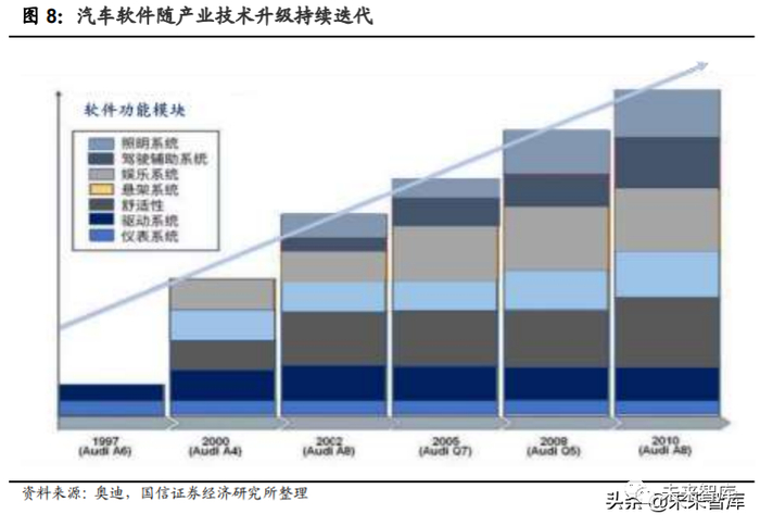 其二:汽车成为复杂的联网设备,软件将扮演重要角色。在大众传统车型上仅 需约 70 个 ECU,功能相对较为分散。而在未来的集成化计算单元体系下,软 件的重要性将愈发凸显,与 ECU 配合定义汽车功能,涵盖操作系统、基础软件 以及其他应用软件的车载软件大众均会自主开发。