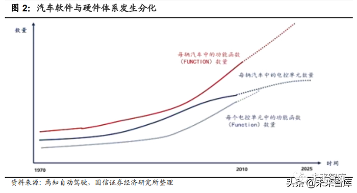 汽车软件与硬件体系发生分化。近几十年随汽车构架升级、性能与用户操作感 需求逐年提升,汽车软硬件数量爆发,并愈发复杂化。在硬件方面,电控单元 数量迅速增长,于 2010 年面临增速放缓的拐点(主要受整车成本与控制器数 量平衡的影响),2025 年随行业集中式电子电气架构趋势持续推进,电控单元 迈向集成化从而控制器数量将较为平稳。在软件方面,各大主机厂软件功能体 系越做越大,其中“功能函数”作为软件体系中的最小单元,其单车数量持续 增大,控制器内部的功能函数复杂度提升,叠加智能座舱新增的应用型软件需 求,软件重要性愈发凸显。2010 年(增速放缓的硬件数量 VS. 急剧攀升的软 件数量)与 2025 年(硬件产业成型 VS.软件加速迭代塑造汽车差异性)为汽车 软硬件发展中两个重要的分水岭。