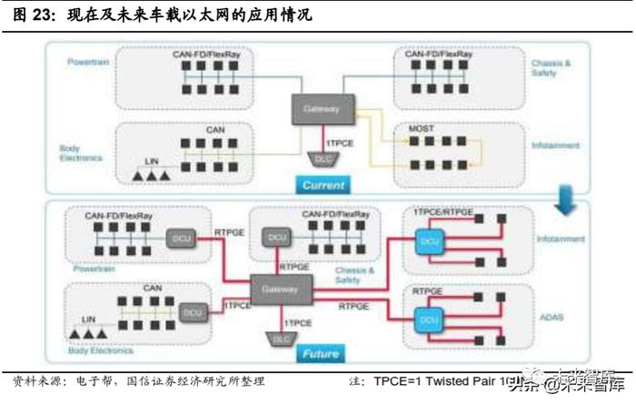 以太网作为车内通信网络大势所趋。随车内数据传输总量及对传输速度要求持 续提升,以及在跨行业的标准协议需求驱动下,支撑更多应用场景、更高速的 以太网有望取代 CAN(主要用于车载控制数据传输,最大带宽 1MB/s)、LIN(低 成本通用串行总线,主要用于车门、天窗及座椅控制)、Most(主要用于发数据 包)等传统汽车车内通信网络成为车内通信网络。在对同样的 ECU 的软件进行 更新时,CAN 模式下的传输时间是以太网的 30 倍。因此,以太网的运用趋势 得到主流整车厂(如宝马、通用等)及半导体公司(如博通、恩智浦等)认可, 均推出符合以太网的应用元件。未来趋势上,以太网并非能一蹴而就完全替代 CAN、LIN,预计多种通信模式将在较长一段时间内共存——CAN、LIN 用于传 感器和执行器等封闭低级网络间的数据传输;以太网(取代 MOST 等技术)用 于域控制器及子部件间的信息交换。
