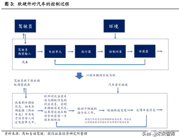 汽车复杂的运作需软硬件结合进行。无论是驾驶舱对汽车电子功能的调用,抑 或汽车与驾驶员和环境互动,均可抽化为软硬件密切配合的模型,即驾驶员的 需求与汽车功能反应之间存在着复杂的控制链条:驾驶员通过机械硬件或部分 虚拟按钮输入期望(例如通过车载按钮、踏板等输入型机械硬件给出期望)→ 驾驶员动作转换为电子信号传入电控单元→执行器控制控制对象达到驾驶员的 需求→传感器向电控系统持续反馈控制达成的具体情况,软件逻辑持续运算向 执行器发出指令,最终达成驾驶员的期望要求。以刹车辅助驾驶为例,在驾驶 员刹车信号不足或过慢的情况下,内置的一套软件逻辑将被激活,让制动系统 自动做出减速相应。在电控单元中快速进行的一次次软件迭代循环,为汽车正 常运作的基石。