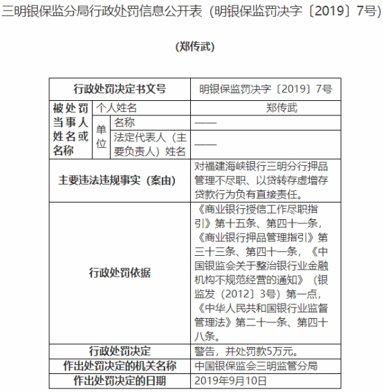 此外,郑传武对福建海峡银行三明分行押品管理不尽职、以贷转存虚增存贷款行为负有直接责任。依据《商业银行授信工作尽职指引》第十五条、第四十一条,《商业银行押品管理指引》第三十三条、第四十一条,《中国银监会关于整治银行业金融机构不规范经营的通知》(银监发(2012〕3号)第一点,《中华人民共和国银行业监督管理法》第二十一条、第四十八条,中国银保监会三明监管分局对其警告,并处罚款5万元。