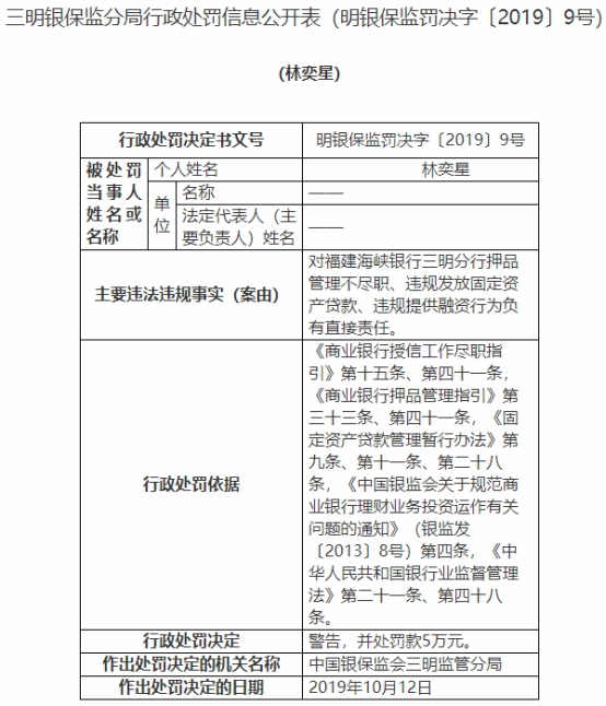 林奕星对福建海峡银行三明分行押品管理不尽职、违规发放固定资产贷款、违规提供融资行为负有直接责任。依据《商业银行授信工作尽职指引》第十五条、第四十一条,《商业银行押品管理指引》第三十三条、第四十一条,《固定资产贷款管理暂行办法》第九条、第十一条、第二十八条,《中国银监会关于规范商业银行理财业务投资运作有关问题的通知》(银监发〔2013〕8号)第四条,《中华人民共和国银行业监督管理法》第二十一条、第四十八条,中国银保监会三明监管分局对其警告,并处罚款5万元。