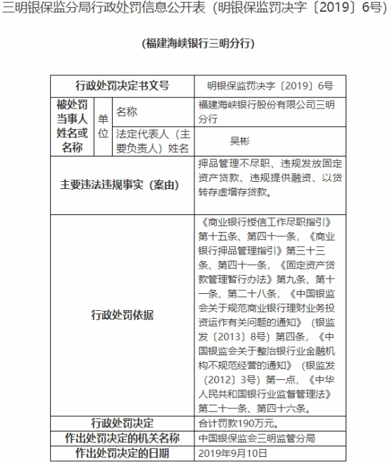 依据《商业银行授信工作尽职指引》第十五条、第四十一条,《商业银行押品管理指引》第三十三条、第四十一条,《固定资产贷款管理暂行办法》第九条、第十一条、第二十八条,《中国银监会关于规范商业银行理财业务投资运作有关问题的通知》(银监发〔2013〕8号)第四条,《中国银监会关于整治银行业金融机构不规范经营的通知》(银监发(2012〕3号)第一点,《中华人民共和国银行业监督管理法》第二十一条、第四十六条,中国银保监会三明监管分局对福建海峡银行股份有限公司三明分行合计罚款190万元。