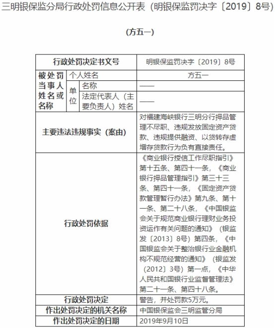 方五一对福建海峡银行三明分行押品管理不尽职、违规发放固定资产贷款、违规提供融资、以贷转存虚增存贷款行为负有直接责任。依据《商业银行授信工作尽职指引》第十五条、第四十一条,《商业银行押品管理指引》第三十三条、第四十一条,《固定资产贷款管理暂行办法》第九条、第十一条、第二十八条,《中国银监会关于规范商业银行理财业务投资运作有关问题的通知》(银监发〔2013〕8号)第四条,《中国银监会关于整治银行业金融机构不规范经营的通知》(银监发(2012〕3号)第一点,《中华人民共和国银行业监督管理法》第二十一条、第四十八条,中国银保监会三明监管分局对其警告,并处罚款5万元。
