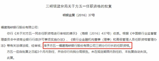 此外,中国银监会三明监管分局于2016年9月29日发布的《关于方五一任职资格的批复》显示,准予方五一福建海峡银行股份有限公司三明分行行长的任职资格。