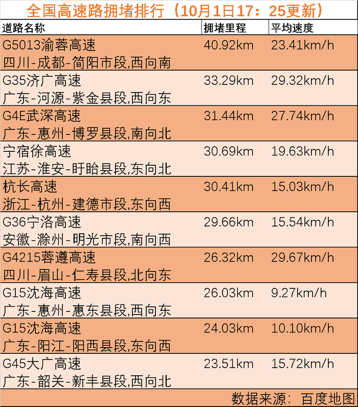 高德地图提示,上述四大区域返程拥堵较为分散,高速拥堵程度低于出程。