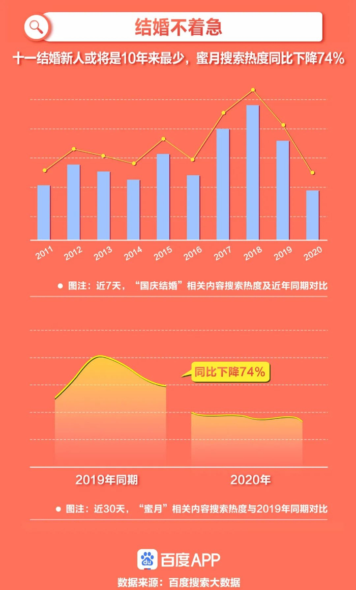 因为2020年春节出行受限,结婚、相亲等“人生大事”也相应进行了时间后移。不过,《每日经济新闻》记者注意到,从近七天百度搜索相关热度来看,2020年“国庆结婚”热度却为近十年最低,而“蜜月”相关搜索也较去年同期下降74%。对于往年婚礼蜜月集中的国庆假期来说,不少新人在今年选择避免聚集。