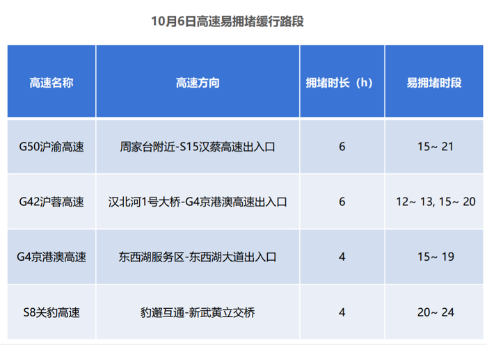 武汉市返程易拥堵缓行的高速主要是G50沪渝高速、G42沪蓉高速、G4京港澳高速等高速的部分路段,建议行驶到以下路段的车主时刻注意路况,及时躲避拥堵。