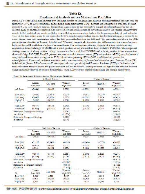 表9的B板考察了动量组合中FSCORE与分析师预测误差以及预测修正之间的关系。该分析的样本由表7中相同的53,011个样本组成。高动量公司的无条件平均预测误差和修正超过低动量公司的平均预测误差和修正。与面板A中记录的年收益规律一致。此表的结果表明,财务报表分析也有助于分析师误差和修正的预测。特别是,FSCORE较低的低动量公司产生最大的负预测误差,而FSCORE较高的成长型公司具有最大的正预测误差和修正。在未列表的结果中,我们还使用公告窗口的收益找到了相似的预测规律。这些发现共同建立了过去动量与历史表现之间的重要联系,并提供了与基于反应不足的解释相一致的新证据。