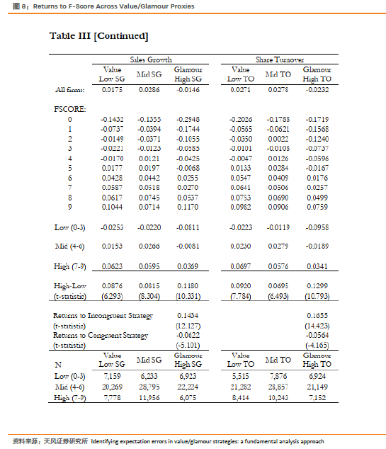 如果价值/成长效应是预期误差的产物,则FSCORE的预测能力应在价值/成长投资组合内部和之间发生变化。具体来说,如果成长(价值)公司的价格反映出过于乐观(悲观)的预期,则价值/成长策略的相对收益应倾向于识别成长型组合中的被高估公司和价值型组合中的被低估公司。换句话说,预期误差应集中在基本面(由FSCORE表示)与当前估值比率所隐含的预期不同的公司中。