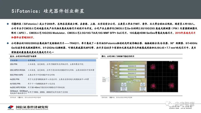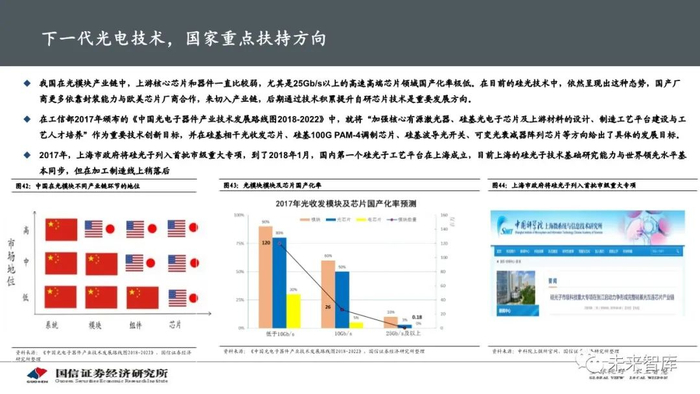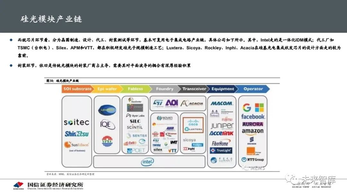 硅光模块产业链的核心在于硅光芯片的商业化和量产,其它环节均有成熟配套,目前该领域以Intel、Luxtera为代表的欧美企业为主 导,国产化率极低,中国厂商更多以封装厂的身份参与到产业中。