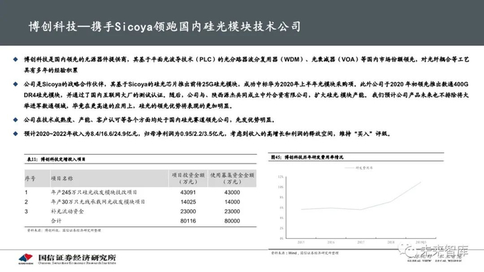 上市公司中,博创科技通过与芯片厂商Sicoya的合作,在华为的支持下优先规模扩产硅光模块,走在各大传统光模块厂商前列,在电 信领域有一定突破性,具备 了一定的先发优势。同时公司产品未来也不排除大举进军数通领域。