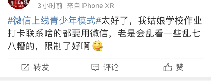 不少网友表示,“青少年模式”有利于防止青少年沉迷网聊,值得点赞。