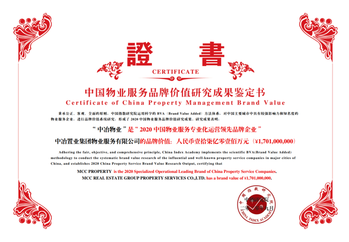 2020年9月10日,由中国房地产TOP10研究组主办,中指控股(CIH)、中指研究院承办的“2020中国房地产品牌价值研究成果发布会暨第十七届中国房地产品牌发展高峰论坛”在北京举行。根据研究成果,中冶置业集团凭借稳中向好的经营业绩和持续提升的综合实力,荣膺“2020中国房地产公司品牌价值TOP10(国有)”称号,品牌价值达人民币200亿元,同比大幅提升35%。中冶置业旗下中冶物业当选“2020中国物业服务专业化运营领先品牌企业”,品牌价值达人民币17亿元。青岛中冶·德贤公馆项目荣获“2020中国房地产项目品牌价值TOP10”称号。本次获奖是中冶置业连续第五年位列中国房地产公司品牌价值TOP10(国有)行列,发展成绩再获行业高度认可。