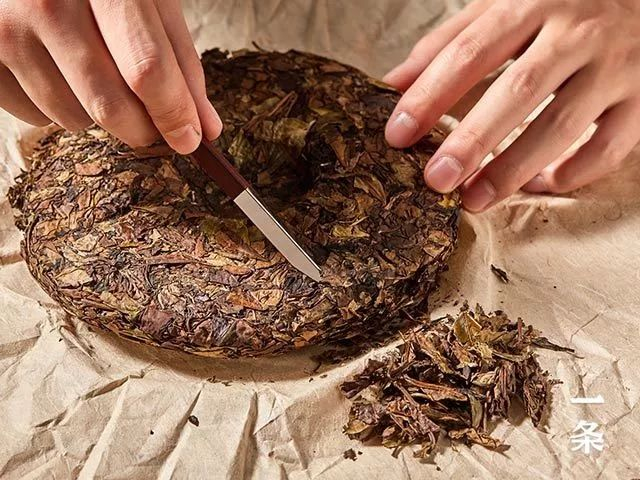 新鲜茶叶采摘下来,经过萎凋、烘干,最后压成紧实的茶饼保存。
