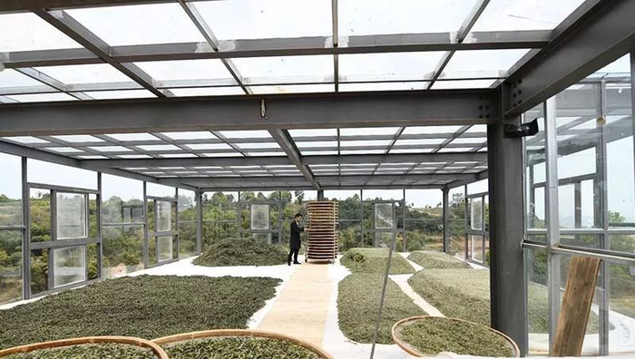精心采摘的新鲜茶叶,薄薄地摊放在竹席上置于微弱的阳光下,让其自然萎凋。
