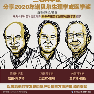 瑞典卡罗琳医学院5日宣布,将2020年诺贝尔生理学或医学奖授予美国科学家哈维·阿尔特、查尔斯·赖斯以及英国科学家迈克尔·霍顿,以表彰他们在发现丙型肝炎病毒方面所做出的贡献。
