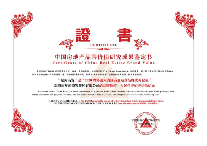 2020年9月10日,由中国房地产TOP10研究组主办,中指控股(CIH)、中指研究院承办的“2020中国房地产品牌价值研究成果发布会暨第十七届中国房地产品牌发展高峰论坛”在北京隆重召开。凭借雄厚实力和在商业地产领域的突出表现,星河商置以116亿的品牌价值荣获“2020中国商业地产公司品牌价值TOP10”、“2020粤港澳大湾区商业运营品牌优秀企业”殊荣。同时,“COCO Park”荣获“2020中国商业地产项目品牌价值TOP10”。