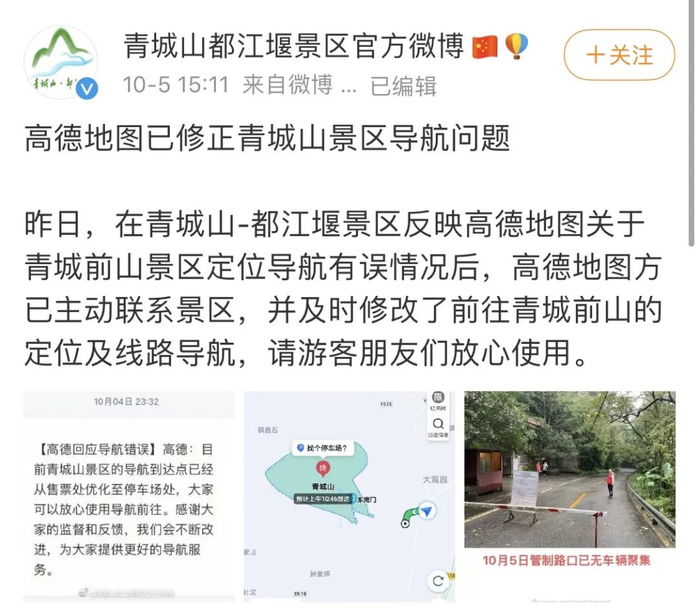 10月4日,四川青城山-都江堰景区官微发文称,近来景区频繁接到游客反映,使用高德地图导航至青城山景区定位错误,将前往青城前山游客导航至已封闭多年的区域,造成严重交通拥堵,给游客和景区管理造成了极大的困扰。