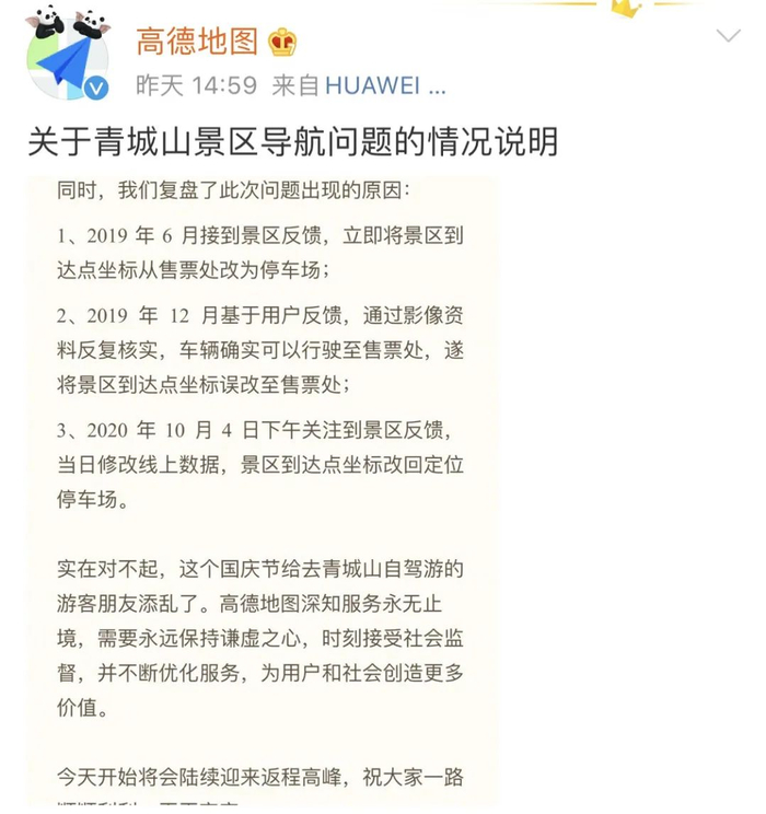 10月5日下午,针对近日四川青城山景区指出的导航错误一事,高德地图在官微复盘了此次问题出现的原因,并已于4日修改线上数据,景区到达点坐标改回定位停车场。同时称会时刻接受社会监督,不断优化服务。