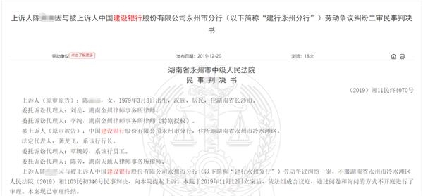 一份公开于去年底的《上诉人陈某因与被上诉人中国建设银行股份有限公司永州市分行(以下简称“建行永州分行”)劳动争议纠纷二审民事判决书》显示: