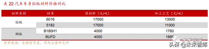 同时成本昂贵也成了限制车身使用大量轻量化材料的重要原因,铝合金的原材料 价格为钢材的 3-4 倍,由于铝制车身各零部件之间的连接工艺目前并不成熟,成品率 低,专业设备配置要求高,加工工艺的成本较已形成成熟体系的钢材贵 10 倍左右, 使得当前铝制车身尚未得到广泛的普及。