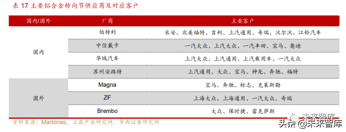 国产铝制转向节加速推进。目前主要铝制转向节的需求来源于奥迪、宝马、奔 驰等高端车型,中低端车型对铝制转向节的需求不足。国外企业有 ZF、Brembo、 Magna 等,其中 ZF 于 2019 年在张家港建立新底盘零部件工厂,生产铝合金转向节 等轻质材料底盘部件。国内对转向节器件生产技术研究逐步发展,综合运用多种技 术提高转向节的生产效率以及质量。国内企业伯特利等企业采用了先进的制造工艺, 凭借其差压铸造工艺与良好的生产一致性,已在底盘轻量化市场占得一定优势;华域 汽车随着通用和大众车型的稳定增长而扩张转向节市场。