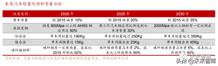 产业助力,轻量化技术为汽车行业的重要发展方向。《中国制造 2025》中在汽 车发展的整体规划上强调了“轻量化仍然是重中之重”;2016 年,中国汽车工程 学会节能与新能源汽车技术路线图发布会中,指出汽车轻量化技术将成为汽车行 业未来重点发展目标之一,其中要在 2025 年,力争整车质量平均减轻 20%,汽 车钢铁比例占汽车总重的30%,单车用铝合金达到250kg,单车用镁量达到25kg, 碳纤维使用量占车辆比重的 2%,对汽车轻量化提出了具体目标。