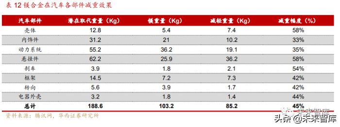 镁合金—市场成长空间大。镁的密度是 1.74 kg/m3,是铝的 2/3,且镁合金材料 耐凹陷性、机械加工性、吸振性好,生产模具寿命高、尺寸稳定,且易于回收,镁合 金在汽车各部件减重效果总降幅可达 45%,作为轻量化材料更合适,受限于加工成 本及技术工艺,现阶段尚不具备量产条件,目前多应用于个别车型的发动机罩盖、转 向盘、座椅支架、车内门板和变速器外壳等方面。