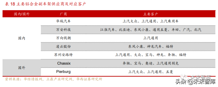 国内企业已布局,国产替代将持续。铝合金副车架对性能有较高要求及较高的 准入门槛。大量的铝合金副车架的需求来源于中高端,如奥迪 A6、A4 和 Q5,同时 大众旗下如迈腾、CC、途观以及奔驰宝马等多款车型也有应用。目前国外企业有 Chassix、Pierburg 等企业,配套奔驰、宝马、奥迪、通用等车型;国内企业已占据 部分市场,其中万安科技深耕三十余年,铝合金副车架业务每年保持 30%增长,形 成年产 100 万台套以上铝合金副车架的产线规模,市场份额将持续提升。