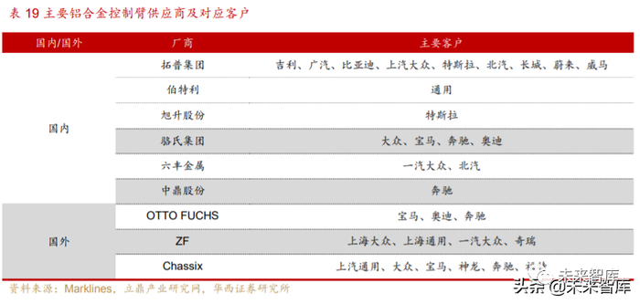 国内车企加速布局,国产替代逐步实现。控制臂作为悬架的导向元件和传力元 件对零件强度有较高要求,其制造工艺复杂,门槛高。目前铝控制臂市场上 ZF、 Chassix 跨国集团为主要国外供应商,其中 Chassix 在纳布里斯及捷克托设立工厂为 汽车业生产铝合金支架、控制臂等。国内拓普集团于 2015 年实现量产锻铝控制臂, 2017 年 12 月收购福多纳,纳入锻铝控制臂等底盘轻量化业务,目前已进入特斯拉、 吉利、比亚迪等供应链,电动化发展及新客户订单的持续突破将提升铝制控制臂的成 长空间。