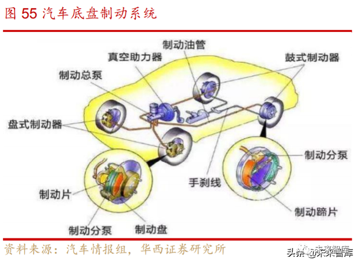 制动系统:汽车最重要的主动安全装置,使行驶中的汽车按照驾驶员的要求减 速、停车,同时保持上下坡车辆稳定及速度稳定。