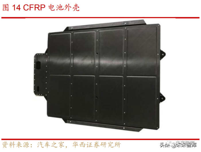 4)轻量化电池壳:德国西格里碳素公司已与中国汽车制造商蔚来达成合作,将 为蔚来研发碳纤维增强型塑料(CFRP)电池外壳原型,该电池外壳比传统的铝或钢 制电池外壳轻 40%,具有高刚性,而且比铝的热导率低 200 倍。采用该材料的电池 包后不仅可为蔚来旗下电动车型减轻一定的重量,还会给换电带来便利。