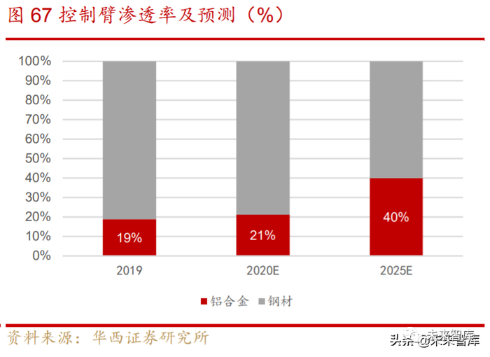 产品种类多样,规模可破 100 亿。控制臂在前、后悬架系统中有更多的细分种 类,产品种类的多样加速了企业更加优化自身生产产品的质量,形成先进技术工艺和 专业加工制造设备的优势。据测算 2019 年铝合金控制臂渗透率为 19%,市场规模为 40.1 亿元,随着企业继续推进自身产品不断渗透,通过制造工艺改进生产效率、降 低生产成本,预计 2025 年铝合金控制臂市场规模可达 104 亿元,渗透率达到 40%, 2020-2025 年 CAGR 为 20.5%。