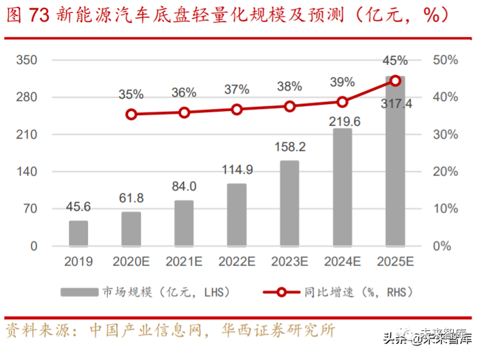 底盘轻量化市场空间有望大幅增加。我们预计铝制控制臂、副车架、转向节、 制动钳轻量化产品渗透率将大幅提升,带动市场份额的大幅增加,2019-2025 年 CAGR 分别为 17%、21%、17%、25%。整体底盘轻量化市场有望从 2019 年的 137 亿元增长至 2025 年的 398 亿元,实现 CAGR 为 19%的高增长。