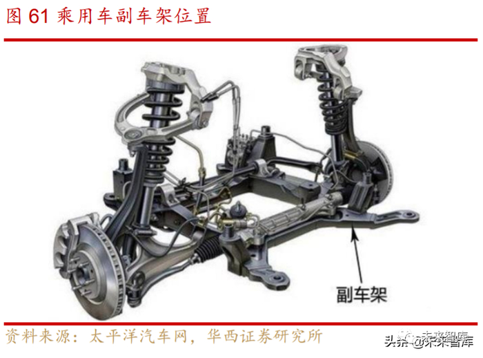 铝合金副车架市场:汽车的副车架是车桥、车轴和差速器等悬架构件的支架, 形成一个车桥总成,通过它再与汽车主车架进行刚性或柔性(橡胶或液压衬垫)连接。在性能上主要目的是减小路面震动的传入,以及提高悬挂系统的连接刚度,副车架的 配置不仅提升车辆舒适性,而且有效提升底盘强度和操控性。