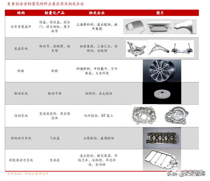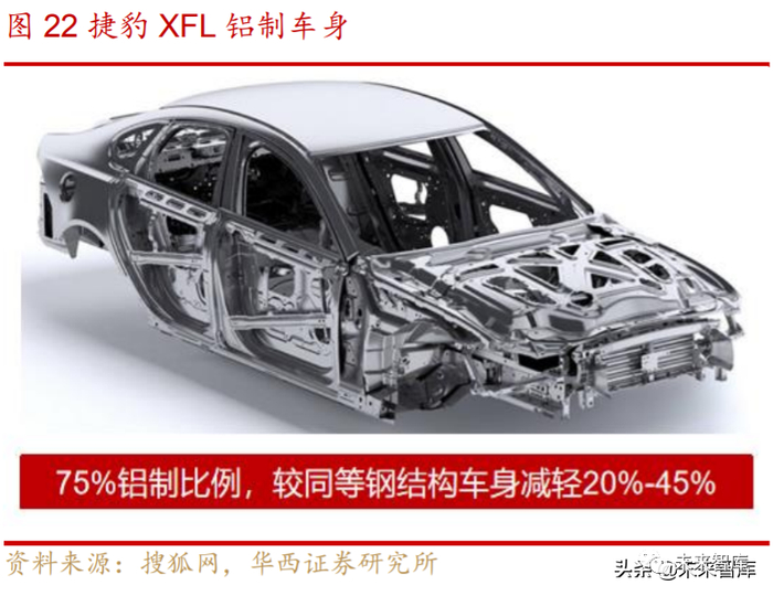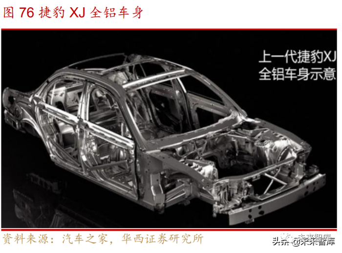 铝合金可广泛应用于车身各系统,显著减少车身重量。铝合金对于车身整体减 重具有显著效果,因此可广泛应用于白车身覆盖件,如顶盖、前后门、翼子板等。汽 车的动力系统、传统系统、制动系统、底盘及轮毂等也占据车体的主要重量,因此也 是铝合金轻量化应用的主要发展方向,采用铝合金车身的捷豹 XF 比上一代车型减重 190kg,减重效果为 10%。新能源汽车方面,动力电池系统是新增系统且重量较大, 对于轻量化需求更加迫切,因此铝合金电池外壳也是新能源汽车轻量化的全新增量。