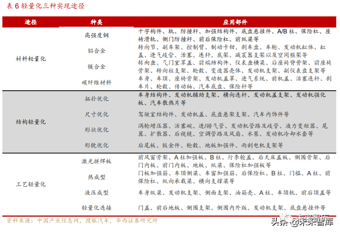 轻量化主要通过轻量化材料搭配特定工艺实现。目前,实现轻量化可以通过三 种途径:1)轻量化材料。如使用结构更轻的高强度钢、铝合金、镁合金、碳纤维复 合材料对传统普通钢结构进行代替。2)轻量化设计。如通过开发全新的汽车架构实 现轻量化、甚至优化车身零部件数量、减少零部件尺寸等。3)轻量化工艺。如热成 型,激光拼焊板等工艺,实务中轻量化主要通过采用轻量化材料搭配特定的轻量化工 艺来实现减重效果。