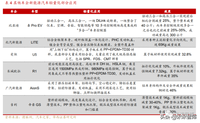 传统车企加码轻量化。进年来,除了新能源汽车造车新势力,传统车企也逐步 进入新能源汽车赛道。同时凭借本身在造车方面的技术积累和资金优势,传统车企在 新能源汽车轻量化方面也有着亮眼的表现。