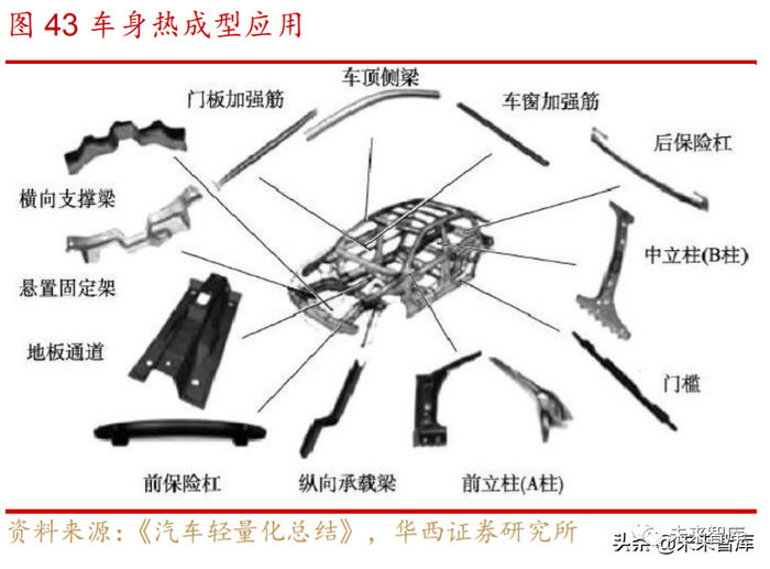 热成型高强度钢是车身轻量化的核心材料。通过热成型工艺加工而成的高强度 钢抗拉强度和屈服强度极高,因此用于车身的关键结构如 A 柱、B 柱、C 柱、车门防 撞梁、前后保险杠等关键位置作为保护乘客的核心安全结构件。