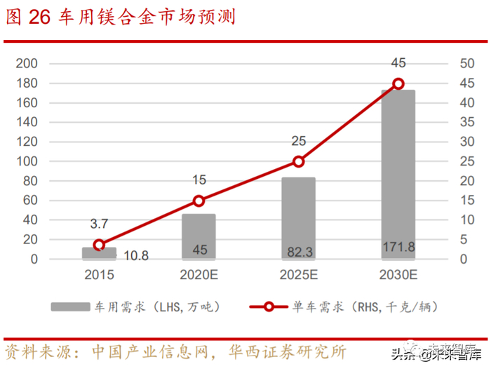 随着镁合金制造工艺及技术升级,成本逐渐降低,轻量化需求升级,单车用量及 总需求将有望提高。根据中国产业信息网预测,我国 2020、2025、2030年车用镁合 金需求将到达 45/82.3/171.8 万吨,2015-2030 年复合增长率达 20.3%,单车需求分 别达到 15/25/45Kg,2015-2030 年复合增长率达 18.1%。