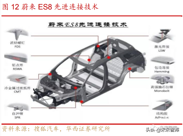 2)先进连接技术:为了应对铝合金材质本身延展性差、形变难以恢复等特点, 蔚来采用多种先进连接技术。包括热融自攻铆接、自冲铆接、铝点焊、冷金属过渡弧 焊、结构胶、激光焊接、高强度抽芯拉等先进连接技术。