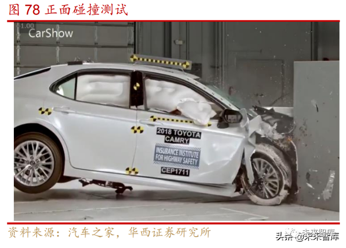1)安全方面,热成型高强度钢制成的车身关键结构可以显著提升汽车车身的抗 撞能力,减小碰撞过程中的驾驶舱形变,有效的保护乘客在行驶碰撞中的生命安全。如中保研正面偏置碰撞测试中,在汽车发动机舱几乎全部溃缩的情况下,采用热成型 高强度钢制成的结构件仍能保持原型,显著增加成员安全性。