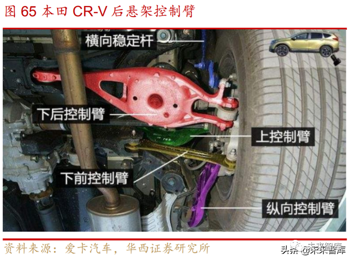 铝合金控制臂市场:汽车控制臂作为汽车悬架系统的导向和传力元件,将作用 在车轮上的各种力传递给车身,同时保证车轮按一定轨迹运动。汽车控制臂分别通过 球铰或者衬套把车轮和车身弹性地连接在一起,因此汽车控制臂应有足够的刚性、疲 劳强度和使用寿命。根据控制臂结构还可分为稳定杆连杆、横拉杆、横臂、控制臂、 纵臂等。
