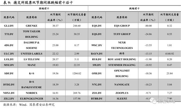 结构:双节期间德股的风格与英股类似,中小盘价值表现抢眼,MSCI德国中小盘价值上涨4.01%,显著优于大盘成长、大盘价值、中小盘成长的1.42%、1.56%、1.55%。德交所涨幅前十的股票为:GRENKE、TOM TAILOR HOLDING、DALDRUP & SOEHNE、UNITED LABELS、LS TELCOM、MANZ、K+S、B+SBANKSYSTEME、NORDEX、ELRINGKLINGER,跌幅前十的股票为:EQS GROUP、TUFFGROUP、NEXR TECHNOLOGIES、拜耳、ROY ASSET HOLDING、STEMMER IMAGING、OPENLIMIT HOLDING、NANOGATE、ZOOPLUS、SLEEPZ。