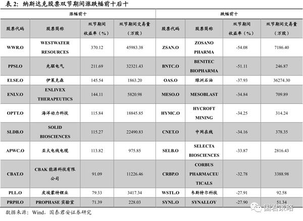 结构:双节期间美股中小盘行情特征明显,MSCI美国中小盘成长与价值分别上涨2.94%与3.62%,显著优于大盘成长与价值的-0.86%与0.49%。纽交所涨幅前十的股票为:AMERICANRENAL ASSOCIATES、万威、容器商店、美国股票投资寿险、汽车一组、纳图兹家具、保证担保、EMERALD、无忧英语、ALTERYX,跌幅前十的股票为:南太地产、HYLIION、BLUEGREEN VACATIONS、新园能源、KENSINGTON CAPITAL ACQUISITION、波奇网、蛋壳公寓、喜满客影城、SOCIALCAPITAL HEDOSOPHIA、AMC娱乐控股;纳斯达克涨幅前十的股票为:WESTWATERRESOURCES、先驱电气、伊莱克森、ENLIVEX THERAPEUTICS、海洋动力科技、SOLID BIOSCIENCES、亚太电线电缆、CBAK能源科技有限公司、皮埃蒙特锂业、PROPHASE实验室,跌幅前十的股票为:ZOSANOPHARMA、BENITECBIOPHARMA、绿洲石油、MESOBLAST、HYCROFTMINING、中网在线、SELECTA BIOSCIENCES、CORBUS PHARMACEU TICALS、韦斯特尔科技、SYNALLOY。