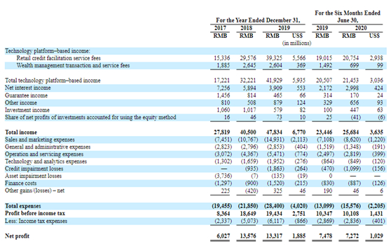 值得注意的是,来自科技技术平台服务的收入贡献比例从2017年的61.9%(172.21亿元)上升至2019年的87.7%(419.29亿元);在2020年上半年,来自技术平台服务的收入贡献比例为83.5%(214.53亿元)。可见陆金所这几年在科技财富转型方面发展迅速,原来的贷款业务和利息收入逐步下降。