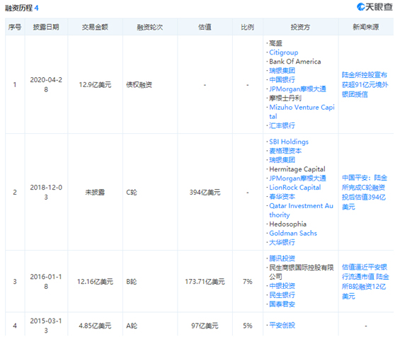 天眼查信息显示,陆金所在上市前进行过几轮融资,陆金所在2015年3月进行A轮融资,由平安创投投资,交易金额是4.85亿美元,估值为97亿美元;2016年1月进行B轮融资,由腾讯投资、民生商银国际、中银投资、民生银行、国泰君安参与投资,交易金额是12.16亿美元,投后估值是173.71亿美元。