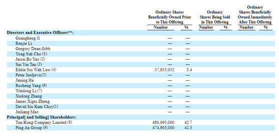 招股书显示,从股权结构来看,平安集团持有公司42.3%的股份,Tun Kung Company Limited持有公司42.7%的股权,其他股东占比15%;其中Eddie Siu Wah Law持股3.4%。陆金所的核心团队包括计葵生、李仁杰等。