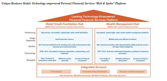 据招股书,现在陆金所的商业模式是以技术为动力的个人金融服务“中心辐射式”(Hub & Spoke)平台。意思是,陆金所通过两个中心枢纽——零售信贷和财富管理,服务小微企业主、规模巨大的中产阶层及富裕人群是其目标客户市场,辐射超50家金融机构、400多家产品提供者(拥有将近8600只产品),通过金融科技技术、长期的信用数据等,为投资者提供符合其风险偏好和个性需求的贷款和理财产品。